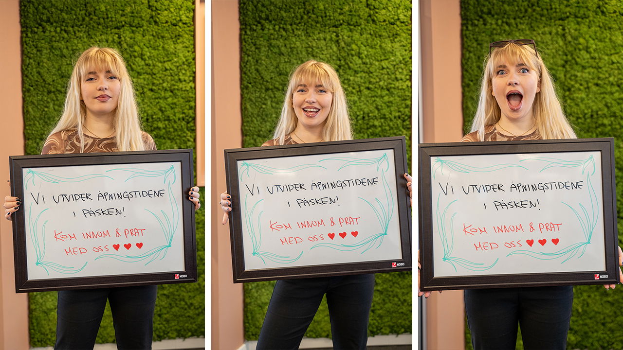 Madelen Endresen er glad for at vi utvider åpningstidene i påsken, og sier at du kan komme innom oss for en prat uansett hvilket humør du er i. Foto: Håkon Lexberg